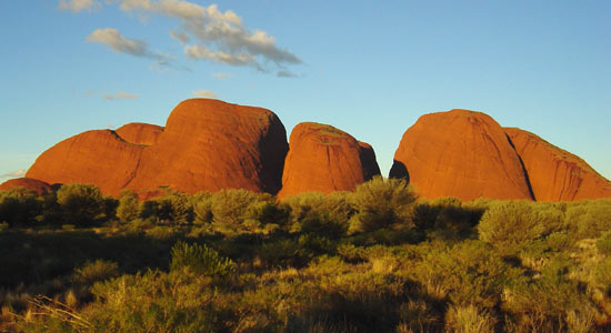 Previous (Up to OJB's Misc Others Photo Page) Kata Tjuta 3Just before the sun sets the sunlight becomes more yellow giving the rocks an orange tint. You can see the foreground vegetation is a golden yellow colour as well. The sky maintains its strong blue and provides a nice contrast. This photo was easier because all the elements are more equally lit.